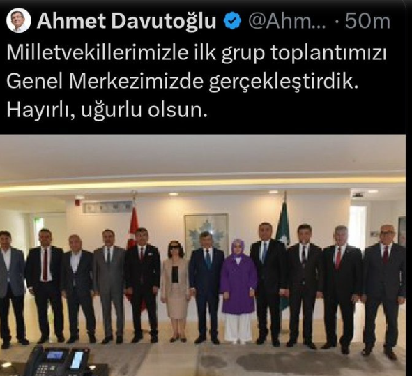 Gelecek Partisi Genel Başkanı Ahmet Davutoğlu’nun seçim sonuçlarına ilişkin itirazlar ve tartışmalar sürerken Twitter’dan, “Milletvekillerimizle ilk grup toplantımızı Genel Merkezimizde gerçekleştirdik. Hayırlı, uğurlu olsun” diyerek fotoğraf paylaşması tepki topladı.