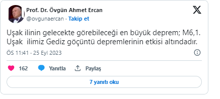 Jeofizik Yüksek Mühendisi Prof. Dr. Övgün Ahmet Ercan, sosyal medya platformu X’ten yapmış olduğu paylaşımda, deprem görülebilecek illere yenisini ekledi. Uşak için 6’dan büyük deprem uyarısı yapan Ercan, “Gediz göçüntü depremlerinin etkisi altındadır” dedi.