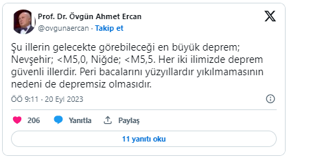 “Şu illerin gelecekte görebileceği en büyük deprem; Nevşehir; <M5,0, Niğde; <M5,5. Her iki ilimiz de deprem güvenli illerdir. Peri bacalarının yüzyıllardır yıkılmamasının nedeni de depremsiz olmasıdır.”