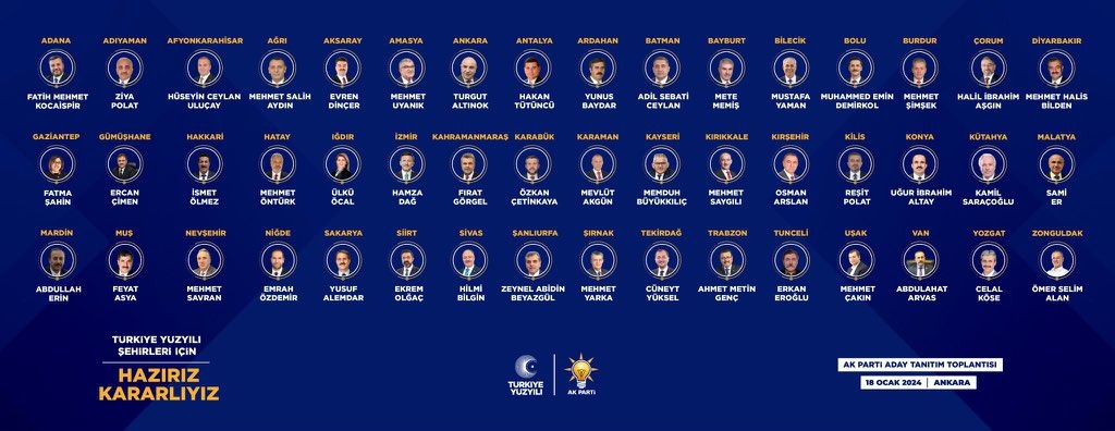 ATO Kongre Merkezi'nde gerçekleştirilecek toplantıda Cumhurbaşkanı Recep Tayyip Erdoğan 17'si büyükşehir 48 belediye başkan adayını daha kamuoyuna duyurdu. Cumhurbaşkanı Erdoğan adayları illerin alfabetik sırasına göre sahneye çağırdı. Programda ilk kez çalınacak şarkılara da yer verildi. Bu kapsamda başkent için “Ankara Ankara canım başkentim” dizelerinin yer aldığı özel bir şarkı hazırlandı.