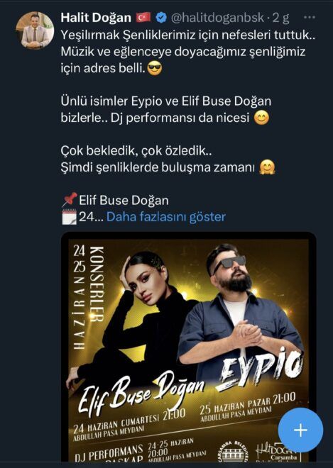 İlçenin AKP’li Belediye Başkanı Halit Doğan da sosyal medya hesabı üzerinden 25 Haziran’da ünlü rapçi Eypio’yunun sahne alacağını iki gün önceden hatırlatarak, “Yeşilırmak Şenliklerimiz için nefesleri tuttuk. Müzik ve eğlenceye doyacağımız şenliğimiz için adres belli. Ünlü isimler Eypio ve Elif Buse Doğan bizlerle… Dj performansı da nicesi. Çok bekledik, çok özledik. Şimdi şenliklerde buluşma zamanı” diyerek duyurdu. Konser afişleri de ilçe merkezinde birçok yere asıldı.