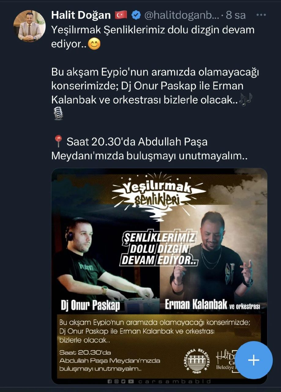 Samsun'un AKP'li Çarşamba Belediyesi, Yeşilırmak Şenlikleri kapsamında ünlü rapçi Eypio'nun sahne alacağını sosyal medya hesabından duyurmuştu. Ancak, gelen tepkiler üzerine Başkan Doğan konseri iptal etti.