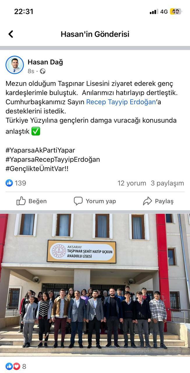 Hasan Dağ'ın Taşpınar Şehit Hatip Uçkun Anadolu lisesinde öğrencilerle toplantı yapması tepkilere neden oldu. Twitter hesabında, ziyareti sırasında çekilmiş fotoğrafları paylaşan Dağ, "Mezun olduğum Taşpınar Lisesini ziyaret ederek genç kardeşlerimle buluştuk. Anılarımızı hatırlayıp dertleştik. Cumhurbaşkanımız Recep Tayyip Erdoğan’a desteklerini istedik. Türkiye yüzyılına gençlerin damga vuracağı konusunda anlaştık" dedi.