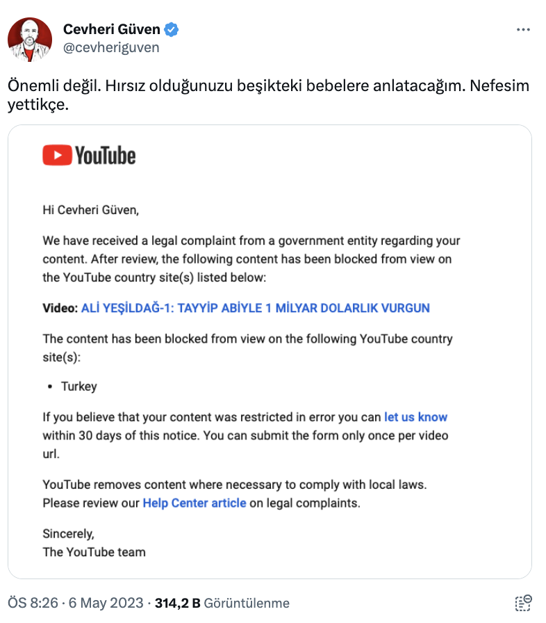 Ali Yeşildağ'ın videosu, FETÖ soruşturması nedeniyle yurt dışına kaçan Cevheri Güven'in YouTube kanalında yayınlanmıştı. Güven, videoya erişim engeli geldiğini duyurdu.