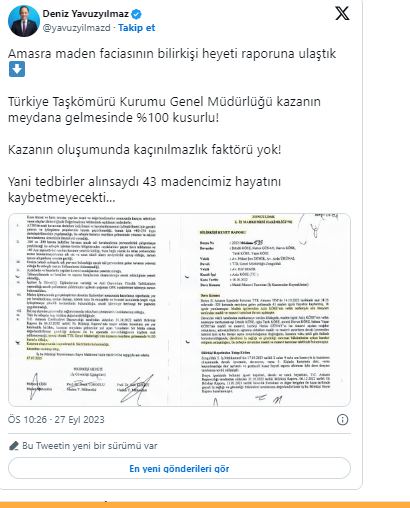 CHP'li Yavuzyılmaz, bilirkişi raporunu sosyal medya hesabından paylaşarak şu notu düştü: "Amasra maden faciasının bilirkişi heyeti raporuna ulaştık Türkiye Taşkömürü Genel Müdürlüğü kazanın meydana gelmesinde %100 kusurlu! Kazanın oluşumunda kaçınılmazlık faktörü yok! Yani tedbirler alınsaydı 43 madencimiz hayatını kaybetmeyecekti…"