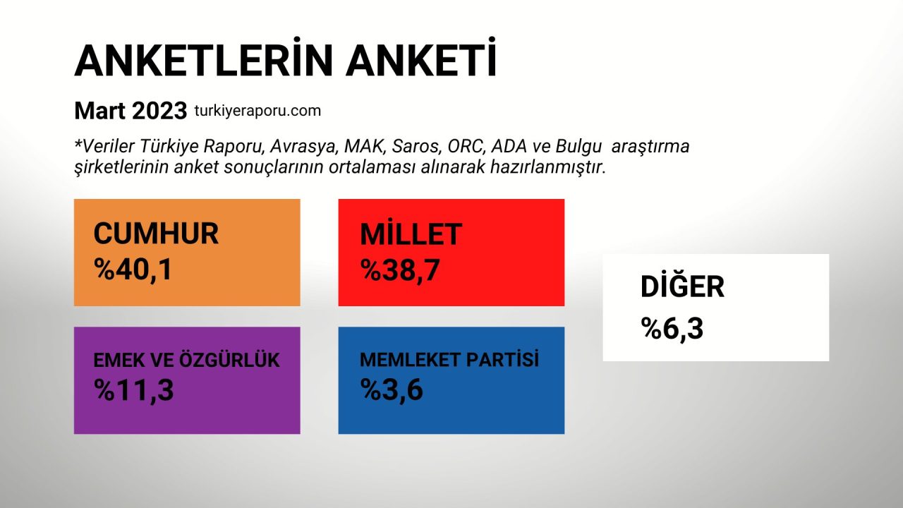 Avrasya Araştırma, MAK Danışmanlık, Saros, ORC, ADA ve Bulgu araştırma şirketlerinin mart ayı anket sonuçlarının ortalaması alınarak yapılan hesaplamaya göre, Millet İttifakı'nın oy oranının yüzde 38,7 olduğu, Cumhur İttifakı'nın ise yüzde 40,1 oy oranına sahip olduğu görüldü.
