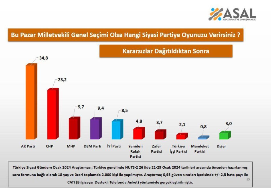 ASAL Araştırma Şirketi, Ocak 2024'te yaptığı "Bu pazar bir seçim olsa" anketinin sonucunu paylaştı. Ankette katılımcılara, "Bu pazar bir milletvekili seçimi olsa hangi siyasi partiye oy verirsiniz?" sorusu yöneltildi.