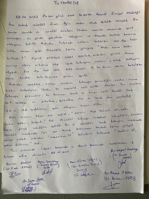 ་Meslektaşımızın kolluğun psikolojik işkenceye itirazı üzerine tartışma yaşanmıştır. Akabinde ifade tutanağı, ifade işleminden farklı olarak, soruların yer almadığı 1 suretten ibaret olarak getirilmiş, meslektaşımızın ifade sırasında yer alan tutanak ile sureti getirilen tutanağın farklı olduğuna dair itirazı üzerine ‘şef’ diye tabir edilen polis memuru yeniden ifade alma odasına gelerek; ‘savcı böyle istedi zaten susma hakkını kullandı’ sözleri ile hukuka aykırı işlemi meşrulaştırmaya çalışmıştır. Meslektaşımızın ifade alma sırasındaki tutanak ile sureti getirilen tutanağın farklı olması sebebiyle imzalamayacağını beyan etmesi üzerine, meslektaşımızın üzerine yürüyerek ‘saygısız, it, haddini bil yoksa bildireceğim’ sözleri ile tehdit ve hakaretlerde bulunmuştur.”