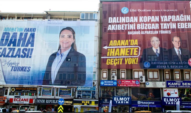 İYİ Parti Adana adayı Ayyüce Türkeş’in “Adana’nın hakkı daha fazlası” yazılı pankartının hemen yanına pankart asan Adana Ülkü Ocakları, pankartta Alparslan Türkeş’in, "Dalından kopan yaprağın akıbetini rüzgar tayin eder!" sözüne yer verdi.