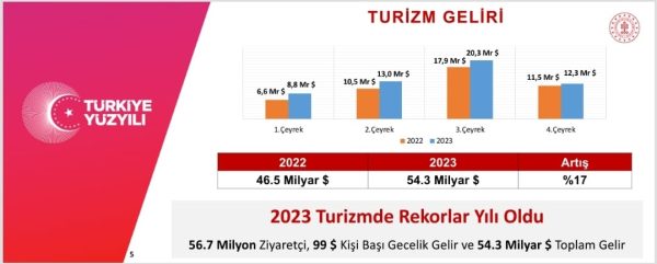 2023 yılında turizm gelirindeki yüzde 17’lik artışın altını çizen Ersoy, "Toplam gelirlere baktığımızda ise geçen yıl pandemide çok başarılı bir süreç yürüten Türkiye, 46.5 milyar dolar rekor bir gelir elde etmişti. 2023 yılı yani geçtiğimiz yıl 54.3 milyar dolar turizm geliri elde ederek, Türkiye yeni bir rekor gerçekleştirdi. Artış oranına baktığımız zamanda yüzde 17’lik bir artışla geçen seneye göre performansını gerçekleştirdi. 56.7 milyon ziyaretçi, 99 dolar kişi başı gecelik gelir ve 54.3 milyar dolar toplam gelirle 2023 turizmde rekor yıl oldu diyebiliriz" ifadelerini kullandı.