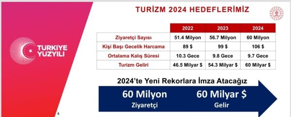 2023 yılındaki başarının 2024 yılında da devam edeceğini öngördüklerini ileten Mehmet Nuri Ersoy, "Ziyaretçi sayısı 2022 yılında, pandemi öncesi rakamlarla 51.4 milyona gelmişti. Bu yıl 56.7 milyonla ziyaretçi rekoru kırıldı, önümüzdeki sene 60 milyon ziyaretçi hedefliyoruz. Yine bizim için öncelikli olan kişi başı gecelik harcamalarda 2022 yılında 89 dolar, geçen yıl 99 dolar gibi bir rekor elde etmiştik. Burada da stratejimize uygun olarak 106 dolarlık kişi başı gecelik gelir bekliyoruz. Gelir olarak baktığımızda ise 46.5 milyar dolarlık 2022 rekorunu bu sene 54.3 milyar dolarla tazeledik. Önümüzdeki sene yeni bir rekorla 60 milyar dolar gelir hedefi hedefliyoruz. Orta vadeli programda (OVP) 59.6 milyar dolar gelir hedefi planlanmıştı. Orta vadeli programla uyumlu bir şekilde önümüzdeki sene 60 milyar dolar hedefliyoruz" diye konuştu.