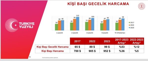Kişi başı gecelik harcamanın daha önemli olduğunun altını çizen Bakan Ersoy, "2017 yılında 65 dolar rakamı ile gerçekleşmişti. 2022 yılında bu rakamın 89 dolara, geçtiğimiz yıl 2023 yılında ise, 99 dolara çıktığını görüyoruz. 2017 ile 2023 yılını karşılaştırdığımız zaman dolar bazında Türkiye yüzde 53’lük bir performans gösterdi. Geçen seneyle kıyasladığımızda da yüzde 12’lik bir artış yakaladığımızı görüyoruz. Kişi başı harcamalara da olumlu yansımaları oluyor. 2017’de 700 dolara kadar düşmüş olan kişi başı gelir, 2022’de 905 dolara, 2023’de 952 dolara çıktı. 2017 ile kıyasladığımızda yüzde 36, geçen yılla kıyasladığımızda yüzde 5’lik bir artış sözkonusu. Ortalama kalış süresi ne kadar uzar veya ne kadar azalırsa rakam da ona göre değişiklik gösteriyor" dedi.