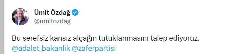Zafer Partisi Genel Başkanı Ümit Özdağ, “Bu şerefsiz kansız alçağın tutuklanmasını talep ediyoruz” dedi.