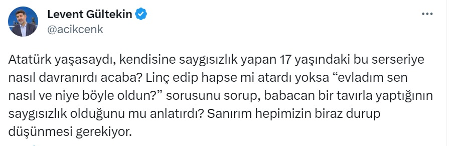 “Atatürk yaşasaydı kendisine saygısızlık yapan 17 yaşındaki bu serseriye nasıl davranırdı acaba? Linç edip hapse mi atardı yoksa “evladım sen nasıl ve niye böyle oldun?” sorusunu sorup, babacan bir tavırla yaptığının saygısızlık olduğunu mu anlatırdı? Sanırım hepimizin biraz durup düşünmesi gerekiyor.”