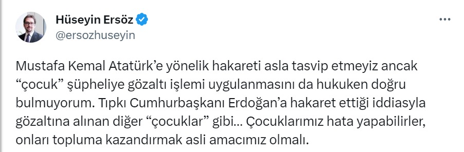Ersöz “Tıpkı Cumhurbaşkanı Erdoğan’a hakaret ettiği iddiasıyla gözaltına alınan diğer “çocuklar” gibi… Çocuklarımız hata yapabilirler, onları topluma kazandırmak asli amacımız olmalı” diye yazdı.