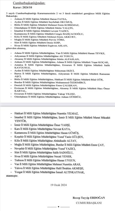 Resmi Gazete'de Cumhurbaşkanı Recep Tayyip Erdoğan'ın imzasıyla yayımlanan karara göre birçok il milli eğitim müdürü görevden alınırken, yerlerine yeni isimler atandı.