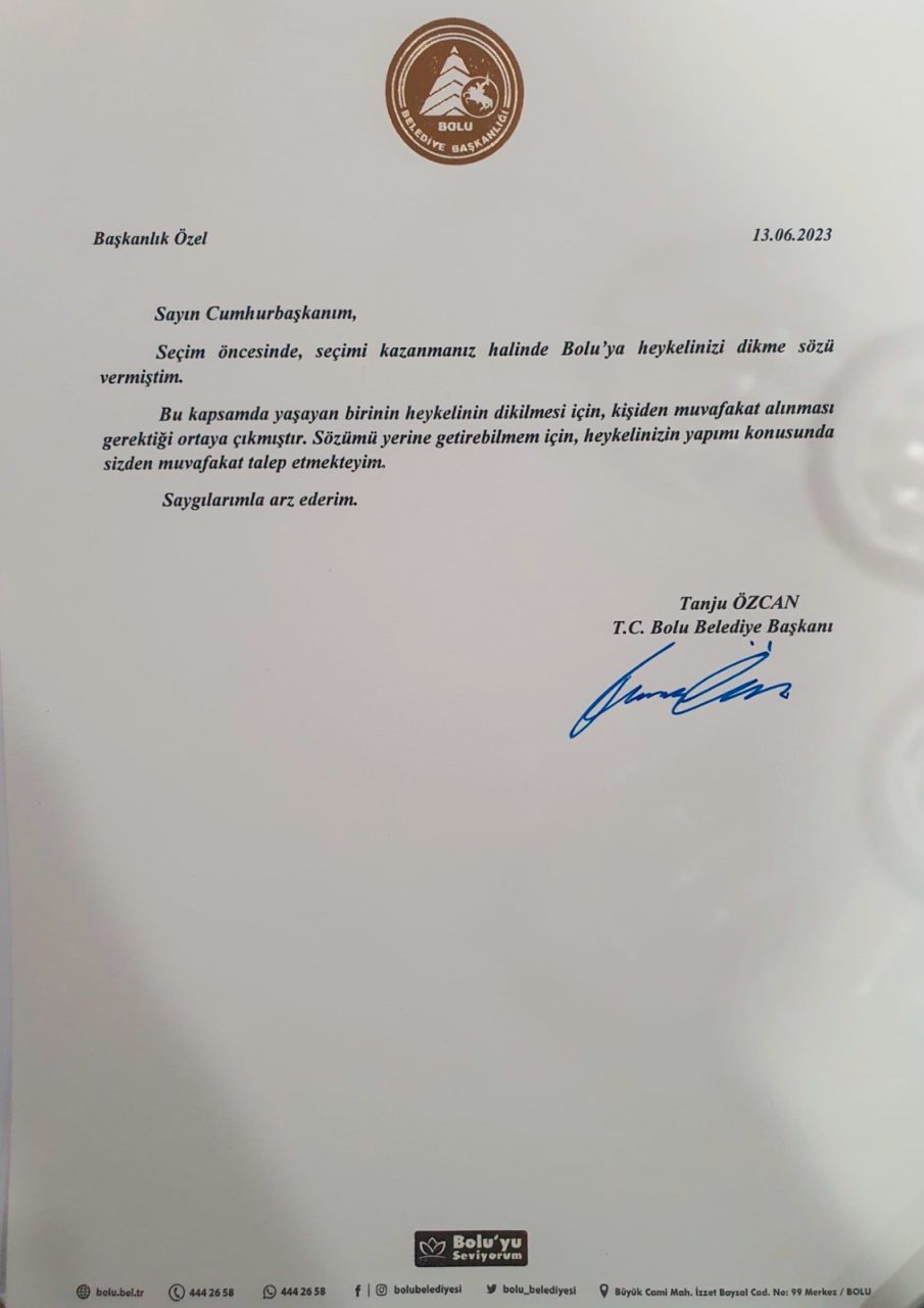 CHP'den ihraç edilen ve bugün itibariyle partisine dönen Bolu Belediye Başkanı Tanju Özcan, Bolu'ya Cumhurbaşkanı ve AKP Genel Başkanı Recep Tayyip Erdoğan'ın heykelini dikmek için Erdoğan'dan muvafakat istedi.