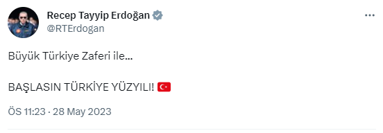 Cumhurbaşkanı Seçimi’nin 14 Mayıs’ta yapılan ilk turunda adayların salt çoğunluğu alamaması nedeniyle Türkiye, cumhurbaşkanını belirlemek için bugün tekrar sandık başına gitti. Tüm yurtta sabah 08.00’de başlayan oy verme işlemi 17.00’de sona erdi. Bugün gerçekleştirilen seçimle 100 yıllık Cumhuriyet tarihinde seçmenler ilk kez ikinci tur için oy kullandı. Seçimin ikinci turunu resmi olmayan sonuçlara göre yüzde 52 oy oranı ile Cumhurbaşkanı ve AKP Genel Başkanı Recep Tayyip Erdoğan kazandı. CHP Genel Başkanı ve Millet İttifakı'nın cumhurbaşkanı adayı Kemal Kılıçdaroğlu kaybetti.