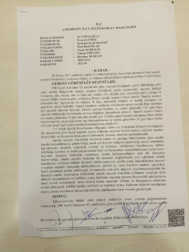14 Mayıs’ta yapılan seçimde Kılıçdaroğlu'na 229 oy, Erdoğan'a 90 oy, Sinan Oğan'a ise 6 oy çıkmış; 5 oy boş çıkarken, 1 oy da geçersiz sayılmıştı.