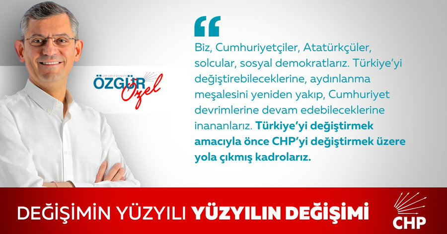 Biz, Cumhuriyetçiler, Atatürkçüler, solcular, sosyal demokratlarız. Türkiye'yi değiştirebileceklerine, aydınlanma meşalesini yeniden yakıp, Cumhuriyet devrimlerine devam edebileceklerine inananlarız. Türkiye'yi değiştirmek amacıyla önce CHP'yi değiştirmek üzere yola çıkmış kadrolarız.