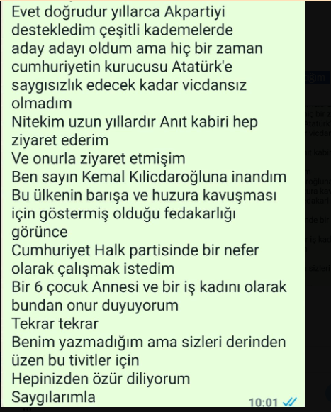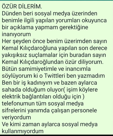 Bütün samimiyetimle ve inancımla söylüyorum ki o tweetleri ben yazmadım. Ben bir iş kadınıyım ve bazen aylarca sahada olduğum oluyor. (İşim köylere elektrik bağlantıları olduğu için). Telefonumun tüm sosyal medya şifrelerini yanımda çalışan personele veriyordum. Ve kimi zaman aylarca sosyal medya kullanmıyordum.