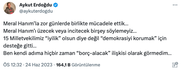 "Meral Hanım’la zor günlerde birlikte mücadele ettik… Meral Hanım’ı üzecek veya incitecek bir şey söylemeyiz… 15 Milletvekilimiz 'iyilik' olsun diye değil 'demokrasiyi korumak' için desteğe gitti… Ben kendi adıma hiçbir zaman “borç-alacak” ilişkisi olarak görmedim…"