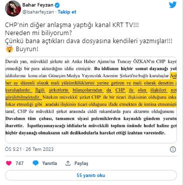 "CHP’nin diğer anlaşma yaptığı kanal KRT TV! Nereden mi biliyorum? Çünkü bana açtıkları dava dosyasına kendileri yazmışlar! Buyrun!" ifadelerini kullanan Bahar Feyzan'ın paylaştığı ilgili görselde ise şu ifadeler yer aldı: