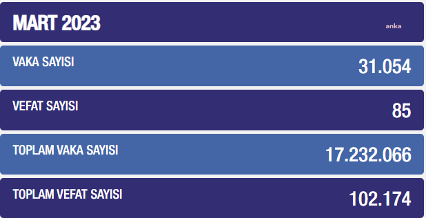 Sağlık Bakanlığı, 5 ay sonra Covid-19 verilerini güncelledi. Geçen yılın Ekim ayından itibaren veri paylaşmayan Bakanlık, 2022 kasım ile aralık ve bu yılın ocak, şubat, mart ayına ait aylık Covid-19 tablosunu birlikte paylaştı. Buna göre Mart’ta 31 bin 54 kişi Covid-19’a yakalanırken 85 vatandaş yaşamını yitirdi. Böylece toplam vaka 17 milyon 232 bin 66, toplam vefat da 102 bin 174 kişi oldu.