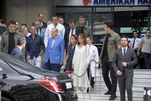 Erdoğan'a, hastane çıkışında Fenerbahçe Spor Kulübü Başkanı Ali Koç, Arzuhan Doğan Yalçındağ ve Mehmet Ali Yalçındağ ile doktorlar eşlik etti. (DHA)