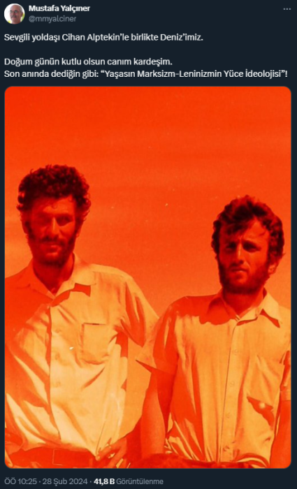 "Sevgili yoldaşı Cihan Alptekin’le birlikte Deniz’imiz. Doğum günün kutlu olsun canım kardeşim. Son anında dediğin gibi: “Yaşasın Marksizm-Leninizmin Yüce İdeolojisi”