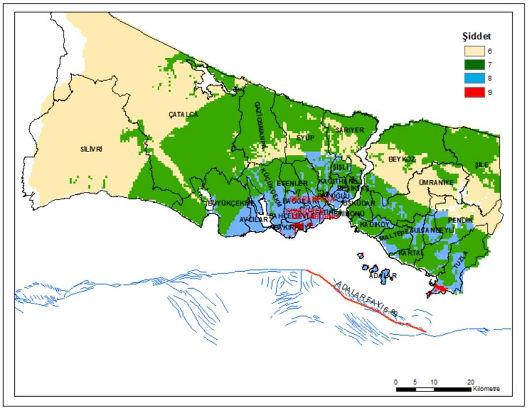 Senaryo-1: Sadece Adalar fayı kırılırsa 6.9 büyüklüğünde deprem beklenir (Şiddet değil). Tuzla ve Adalar'da zayıf zeminlerde yerel olarak IX şiddet değerlerine ulaşılır.