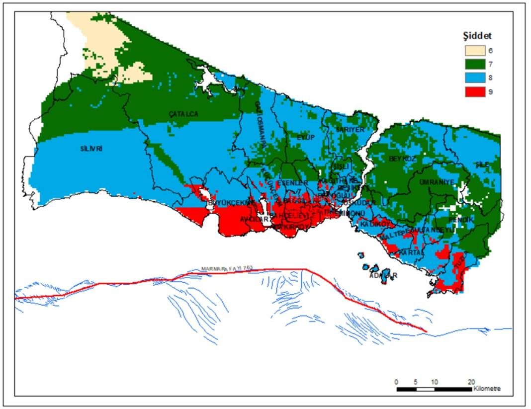 SENARYO 3- Batı ve Orta Marmara Fayı birlikte kırılırsa (zayıf ancak olası bir senaryo) deprem büyüklüğü 7.5, olası şiddet Mimarsinan-Eminönü sahiline paralel olarak 10-15 km boyunca ve Anadolu yakasının zayıf zeminlerinde IX ve üzeri olabilir.