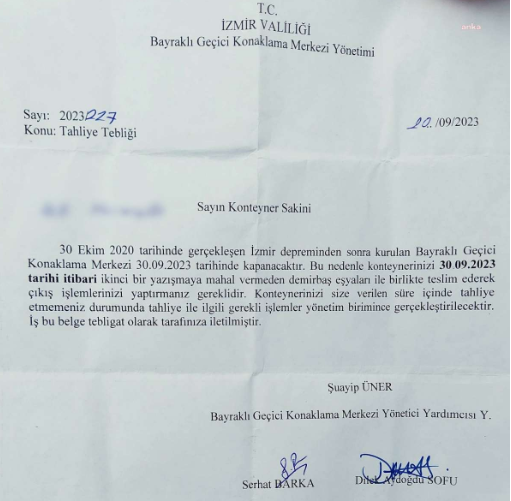 “Sayın Konteyner Sakini, 30 Ekim 2020 tarihinde gerçekleşen İzmir depreminden sonra kurulan Bayraklı Geçici Konaklama Merkezi 30.09.2023 tarihinde kapanacaktır. Bu nedenle konteynerinizi 30.09.2023 tarihi itibari ikinci bir yazışmaya mahal vermeden demirbaş eşyaları ile birlikte teslim ederek çıkış işlemlerinizi yaptırmanız gereklidir. Konteynerinizi size verilen süre içinde tahliye etmemeniz durumunda tahliye ile ilgili gerekli işlemler yönetim birimince gerçekleştirilecektir. İş bu belge tebligat olarak tarafınıza iletilmiştir.” (ANKA)