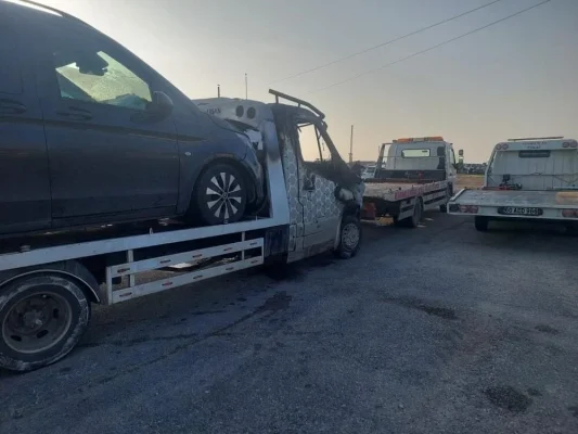 Destici'nin kaza yapan makam aracını çeken çekici yandı