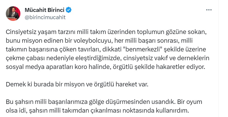AKP MKYK Üyesi Mücahit Birinci, Twitter (X) hesabından “Cinsiyetsiz yaşam tarzını Milli Takım üzerinden toplumun gözüne sokuyor. Bir oyum olsa idi, şahsın milli takımdan çıkarılması noktasında oy kullanırdım” diye yazdı.