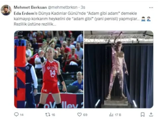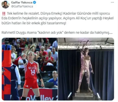 A Milli Kadın Voleybol Takımı'nın kaptanı Eda Erdem için yapılan törende, Türkiye Voleybol Federasyonu Başkanı Mehmet Akif Üstündağ'ın "Adam gibi adam" sözlerinin yanı sıra heykelin erkeğe benzetilmesi de gündem oldu.