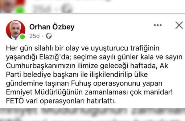 Elazığ'da AKP'li belediyelere yönelik yapılan fuhuş ve yolsuzluk operasyonları sonrası yaşanan tartışmalara MHP de dahil oldu. MHP eski milletvekili adayı Prof. Dr. Orhan Özbey, Elazığ Emniyeti'ne "FETÖ" göndermesi yaptı.