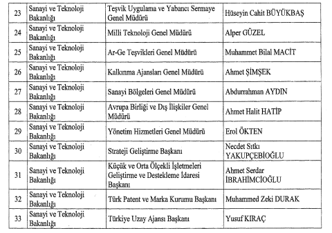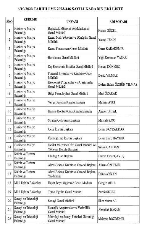 Erdoğan, Hazine ve Maliye Bakanlığı, Kültür ve Turizm Bakanlığı, Milli Eğitim Bakanlığı, Sanayi ve Teknoloji Bakanlığı’na bağlı müdürlüklere çok sayıda atama yaptı. Resmi Gazete’de yayınlanan atamalar şu şekilde: