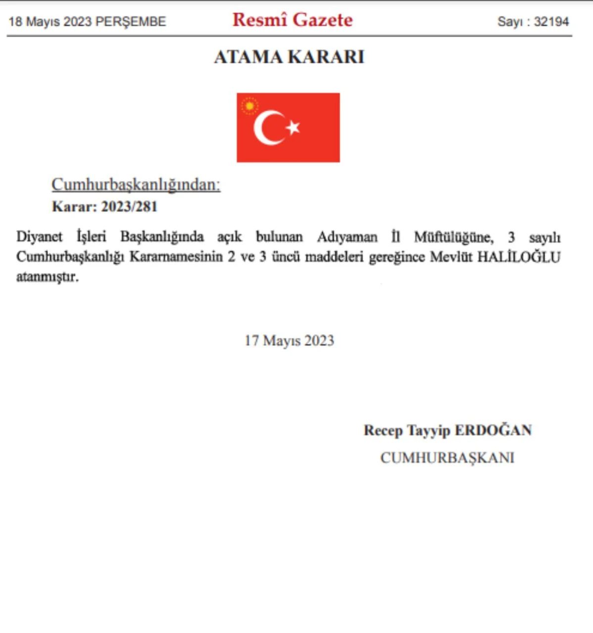 Diyanet İşleri Başkanlığı'na ilişkin atama kararı Resmî Gazete'de yayımlandı.AKP'li Cumhurbaşkanı Recep Tayyip Erdoğan imzasıyla Resmî Gazete'de yayımlanan karara göre, Diyanet İşleri Başkanlığında açık bulunan Adıyaman...
