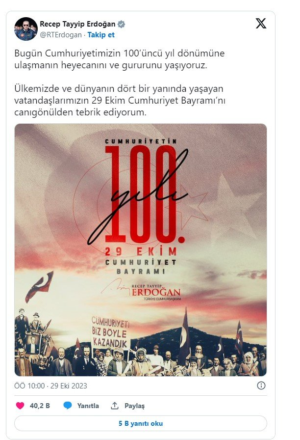 Cumhurbaşkanı Recep Tayyip Erdoğan, X adlı platformda Türkiye Cumhuriyet’inin 100’üncü yaşına ilişkin bir kutlama mesajı paylaştı.