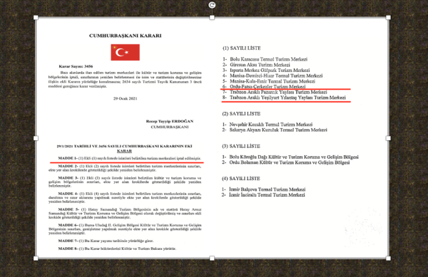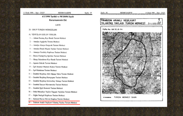 Bahadır Özgür Gazete Duvar'daki bugünkü yazısında üç yıl önce 30 Ocak 2021 tarihle Resmi Gazete’de Cumhurbaşkanı kararlarıyla bir kalemde tam 14 yerin sınırının değiştirdiğini Trabzon’daki Araklı Pazarcık Yaylası ile Araklı Yeşilyurt Yılantaş Yaylası’nın turizm merkezi olmaktan çıkarıldığını yazdı.