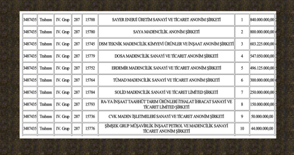 İhalede en pahalı ruhsatı 840 milyon lira ile Sayer Enerji aldı. 6 Şubat 2020’de İstanbul’da kuruldu. Ortaklarının izi sürüldüğünde iç içe şirketlerin sonucunda ulaşılan nihai adres İstanbul Altın Rafinerisi AŞ.’nin sahibi olan Halaç Ailesi. İkinci sıradaki Saya Madencilik ise Ocak 2024’te Ankara’da kuruldu. Kasım 2023’te İstanbul’da kurulmuş Nakkaş Holding’in bir şirketi. Nakkaş Holding ise Ramazan Öztürk’e ait. Bir dönem Murat Sancak ile BMC’de ortak olan Talip Öztürk’ün oğlu. Suriye petrolleri ile beraber ismi sık anılan Transpet Petrolcülük’te de baba-oğul Öztürk ile Sancak ortaklardı.