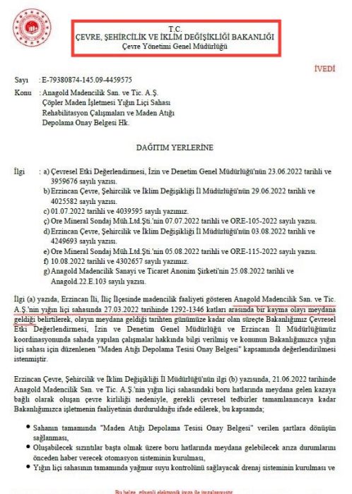 Anagold tarafından işletilen aynı maden sahasında, 27 Mart 2022 tarihinde de bir kayma yaşandığını paylaşan Yavuzyılmaz, olaya ilişkin Çevre ve Şehircilik Bakanlığı tarafından hazırlanan raporu yayınladı.