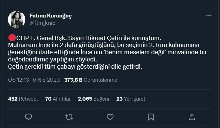 Gazeteci Fatma Karaağaç sosyal medya hesabından yaptığı paylaşımda, Çetin'in Muharrem İnce ile görüşmesinde, seçimin 2. tura kalmaması gerektiğini söylediğini aktardı. İnce'nin yanıt olarak ise 'benim meselem değil' minvalinde bir değerlendirme yaptığını da aktaran Karaağaç, "Çetin gerekli tüm çabayı gösterdiğini dile getirdi" dedi.