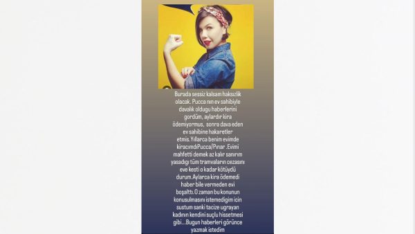 “Burada sessiz kalsam haksızlık olacak. 'Pucca'nın ev sahibiyle davalık olduğu haberlerini gördüm, aylardır kira ödemiyormuş, sonra dava eden ev sahibine hakaretler etmiş. Yıllarca benim evimde kiracımdı Pucca/Pınar. Evimi mahvetti demek az kalır sanırım yaşadığı tüm travmaların cezasını eve kesti o kadar kötüydü durum. Aylarca kira ödemedi, haber bile vermeden evi boşalttı. O zaman bu konunun konuşulmasını istemediğim için sustum sanki tacize uğrayan kadının kendini suçlu hissetmesi gibi... Bugün haberleri görünce yazmak istedim…”