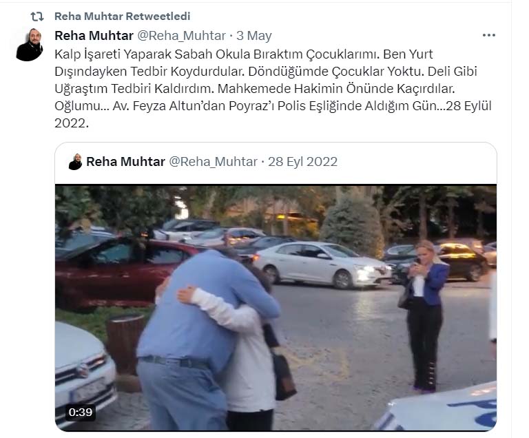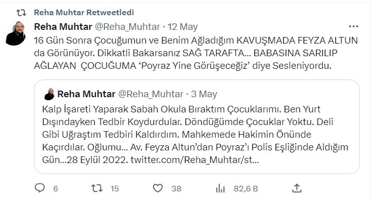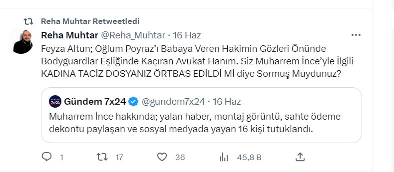 “Neredeyse 8 aydır Reha Muhtar’ın tacizlerine maruz kalıyorum. Velayet davasına benim siyasi tweetlerimi koyuyor, dosyada avukat olduğumu taraf olmadığımı kestiremiyor. Aylardır dosyaları bırakmam için yapmadığını bırakmadı. Hepsini anlatacağım bir gün, korku filmi gibi. Aylardır sürekli benimle ilgili tweet atıyor. Dosyada gerekeni yapmamam için sürekli sözlü saldırıda bulunuyor. Duruşmalara gözlemci talep ediyorum yazılı olarak da barodan talep ettim.”