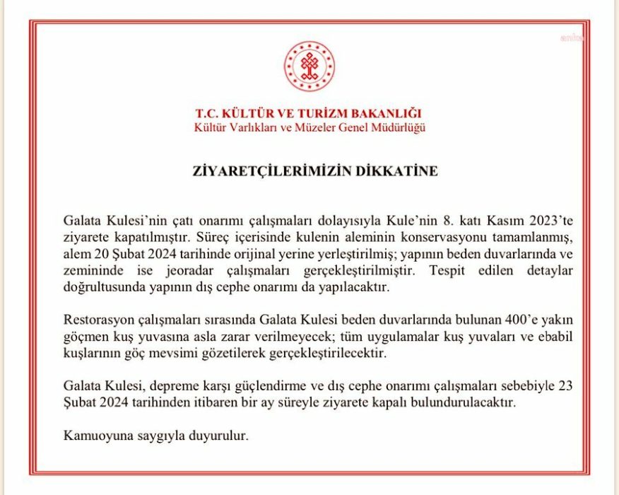Restorasyon çalışmaları sırasında Galata Kulesi beden duvarlarında bulunan 400’e yakın göçmen kuş yuvasına asla zarar verilmeyecek; tüm uygulamalar kuş yuvaları ve ebabil kuşlarının göç mevsimi gözetilerek gerçekleştirilecektir. Galata Kulesi, depreme karşı güçlendirme ve dış cephe onarım çalışmaları sebebiyle, 23 Şubat 2024 tarihinden itibaren 1 ay süreyle ziyarete kapalı bulundurulacaktır.”