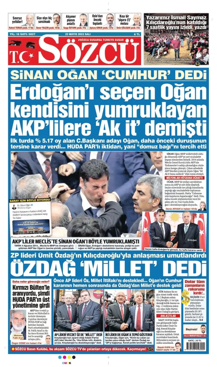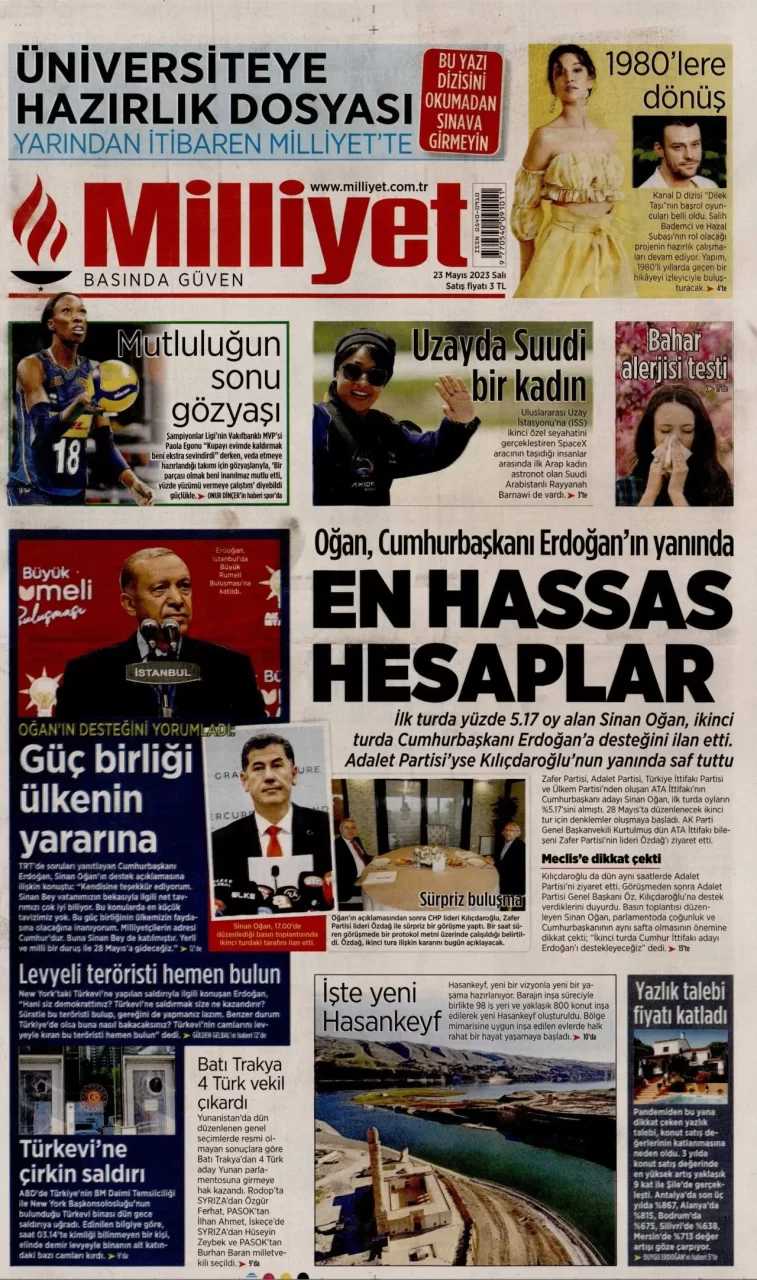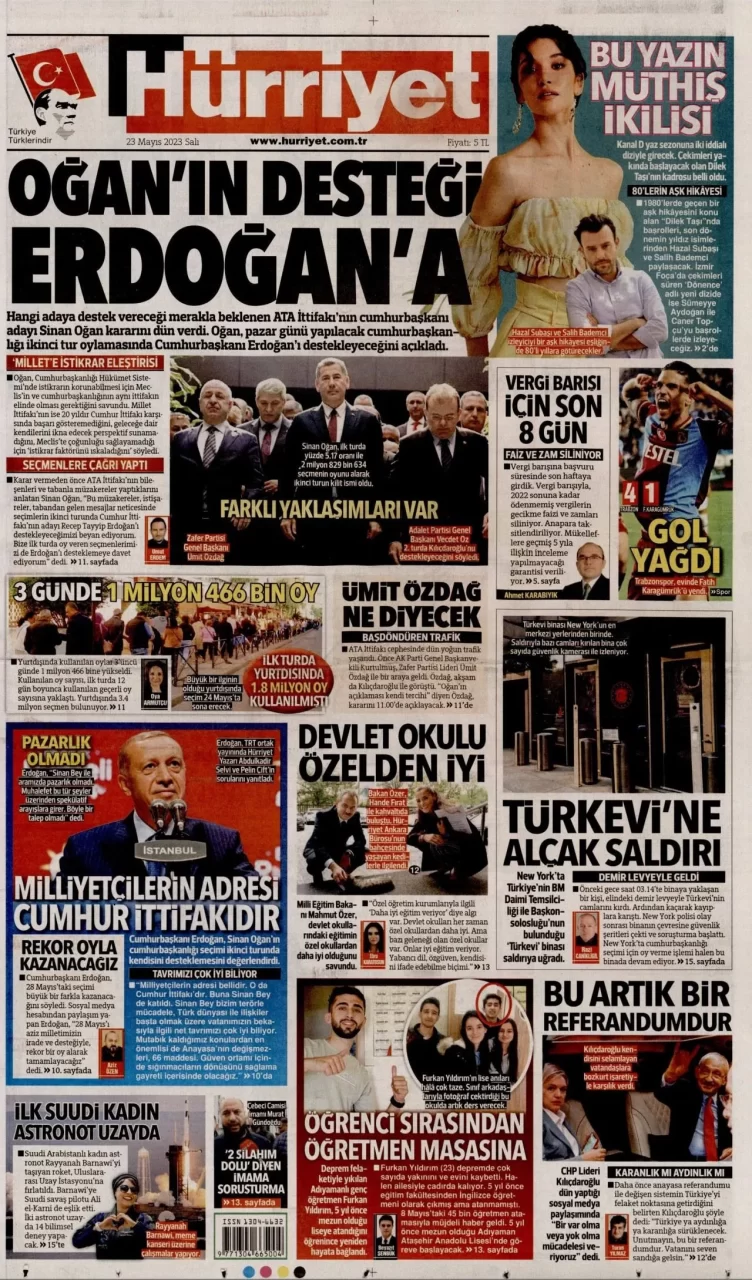 Ata İttifakı'nın cumhurbaşkanı adayı Sinan Oğan, dün ikinci turda Cumhurbaşkanı ve AKP Genel Başkanı Recep Tayyip Erdoğan'ı destekleyeceğini açıkladı. Oğan'ın açıklaması gazetelerin ilk sayfalarında yer aldı.Oğan'ın...
