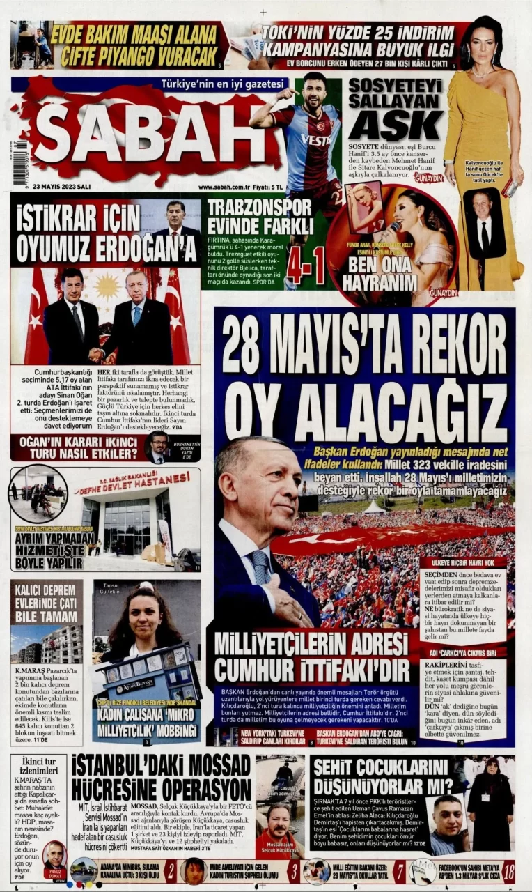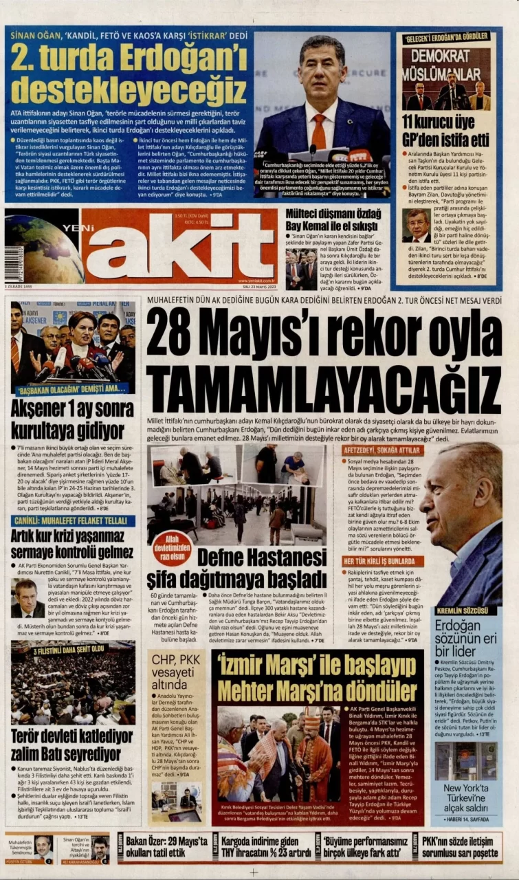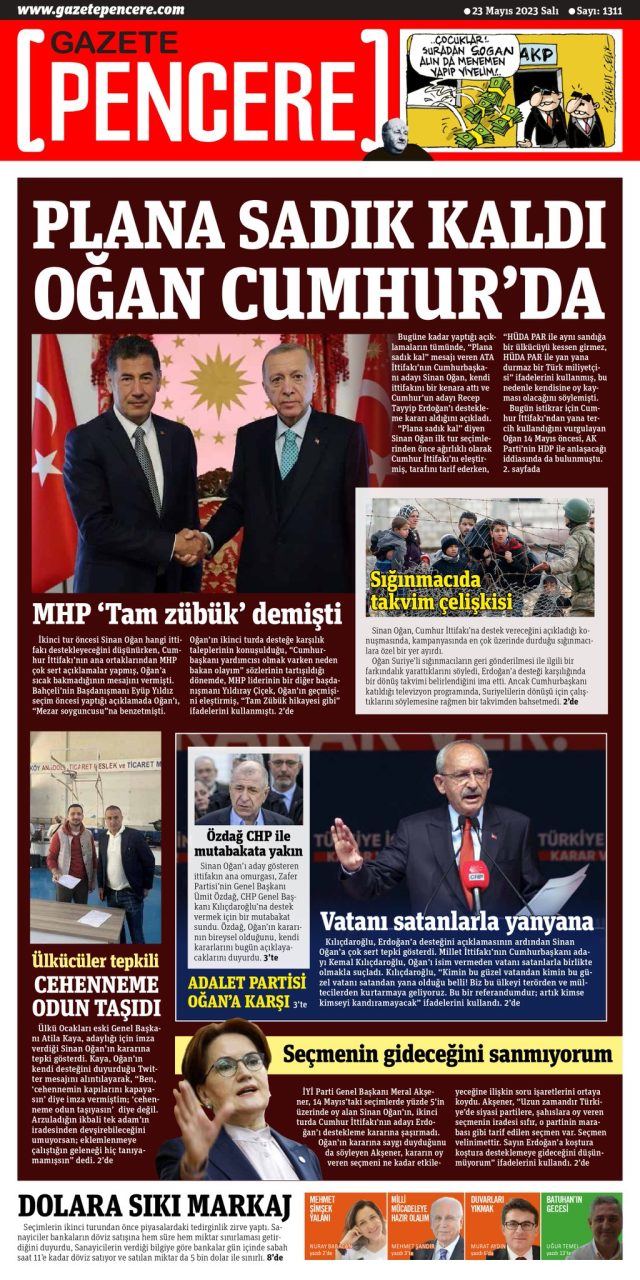 Ata İttifakı'nın cumhurbaşkanı adayı Sinan Oğan, dün ikinci turda Cumhurbaşkanı ve AKP Genel Başkanı Recep Tayyip Erdoğan'ı destekleyeceğini açıkladı. Oğan'ın açıklaması gazetelerin ilk sayfalarında yer aldı.