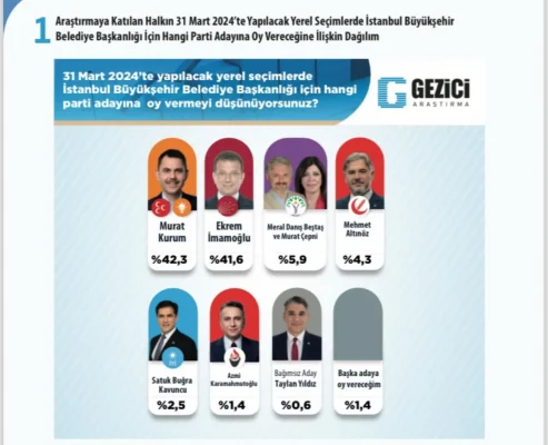 Gezici Araştırma Merkezi tarafından, İstanbul genelinde sosyal, ekonomik, politik ve kültürel konular ile ilgili seçmenin algısını belirlemek üzere 15-17 Mart 2024 tarihleri arasında yapılan anket çalışmasının sonuçları ortaya çıktı.